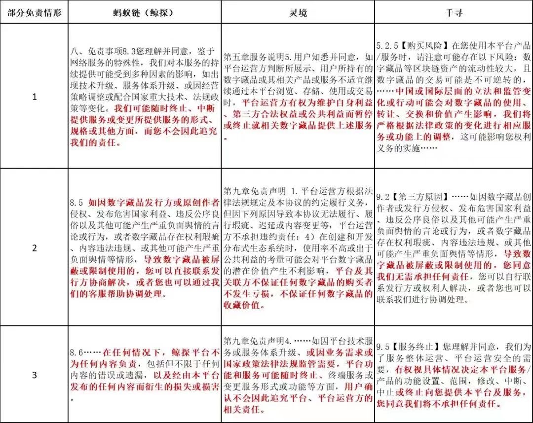 如果出现了非因用户自身原因,平台限制用户使用或终止服务的情形,平台往往给自己设置了免责条款。笔者整理了《蚂蚁链数字藏品平台用户服务协议》(20220706版本)、《灵境数字藏品平台用户协议》(20220401版本)与《千寻数藏平台用户服务协议》(20220322版本)相关重要条款,进行了简单的比对: