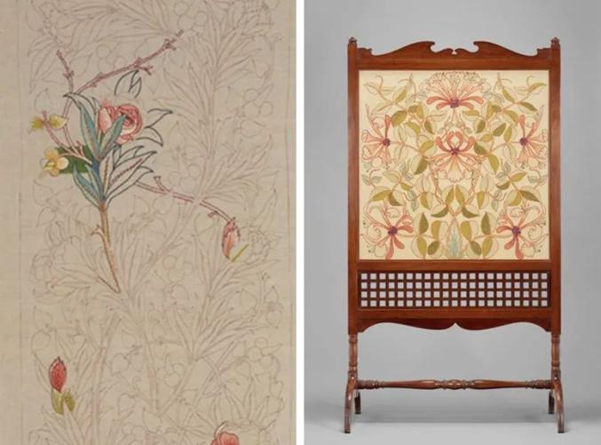 左图/牡丹,亨利·迪尔;右图/忍冬防火屏风,梅·莫里斯梅的作品沿袭了父亲的风格,清新、自然、花鸟共生,但两人的设计又有不同。她更注重表达物象的内在意蕴,对植物的观察与描绘也更细致入微,让心生向往。对重复图案和对称性,她并无特别偏好,构图相对松散,更关注整体。