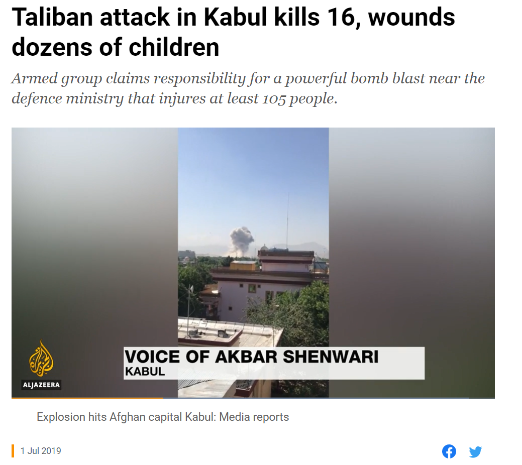 半岛电视台(Al-Jazeera)援引喀布尔当地警察的话报道,一辆装满炸弹的卡车在阿富汗国防部大楼外爆炸,事故造成16人死亡、105人受伤,其中包括51名儿童和5名妇女。阿富汗塔利班宣布对此次袭击负责。