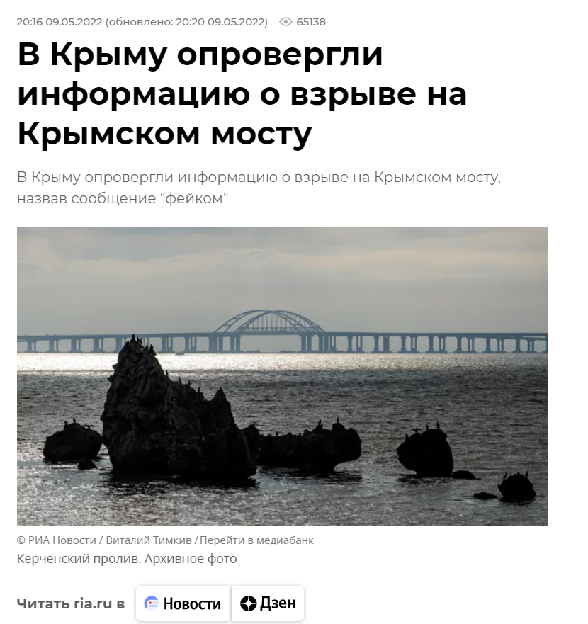 今年5月初,社交网络频频有消息传出,克里米亚大桥发生爆炸。俄新社5月9日援引克里米亚信息政策官员奥列格·克留奇科夫(Oleg Kryuchkov)的话,驳斥了有关克里米亚大桥爆炸的信息,称之为“虚假的乌克兰宣传”。