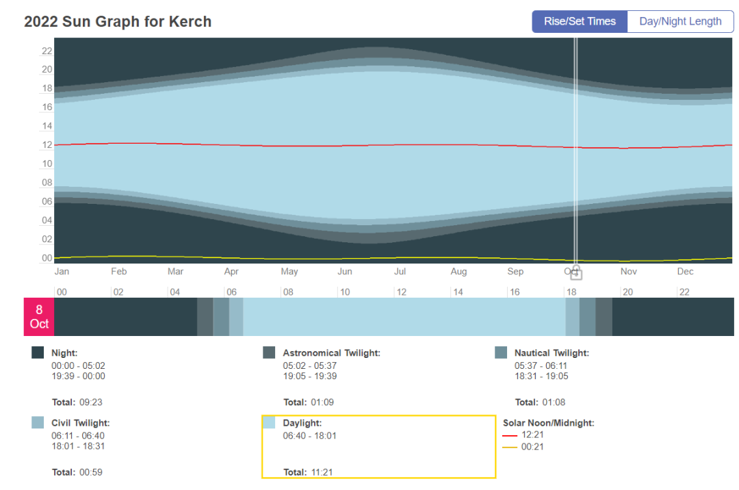 除此之外,视频细节同爆炸发生时的实际情况不符。俄罗斯国家反恐委员会表示,爆炸发生于当地时间10月8日早晨6点07分。据天气服务网站timeanddate.com显示的信息,10月8日,克里米亚大桥所在地刻赤的日出时间在6点40分左右。因此,爆炸发生时尚属黑夜。这一点在其他官方放出的爆炸现场影像中也可以得到印证。然而,网传视频拍摄时,显然天已大亮,故而不可能摄于克里米亚大桥爆炸瞬间。