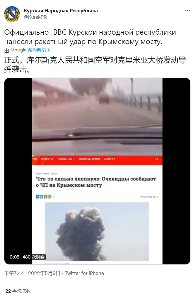 明查使用视频处理软件InVid截取网传视频关键帧,在Yandex搜索引擎中对图片进行反向搜索后发现,原视频至少于今年5月初就已经出现。5月9日,一名为“库尔斯克人民共和国”( Курская Народная Республика)的推特账号发布以上视频,称“库尔斯克人民共和国空军对克里米亚大桥发动导弹袭击”。推文还包括一张疑似报道截图,标题为《有东西猛烈撞击:目击者报告克里米亚大桥发生紧急情况》。