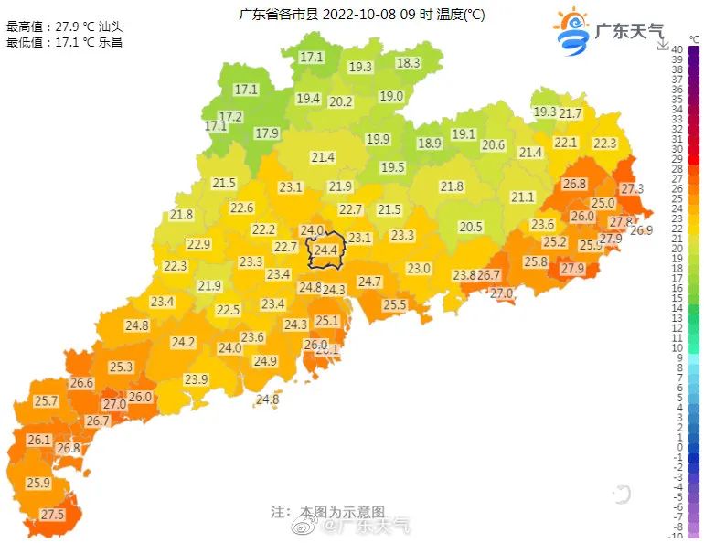 10月9日夜间-10日,雷州半岛阵雨转多云,其余市县晴到多云。最高气温:粤北、粤西和珠三角大部24℃~28℃,其余市县29℃~31℃。