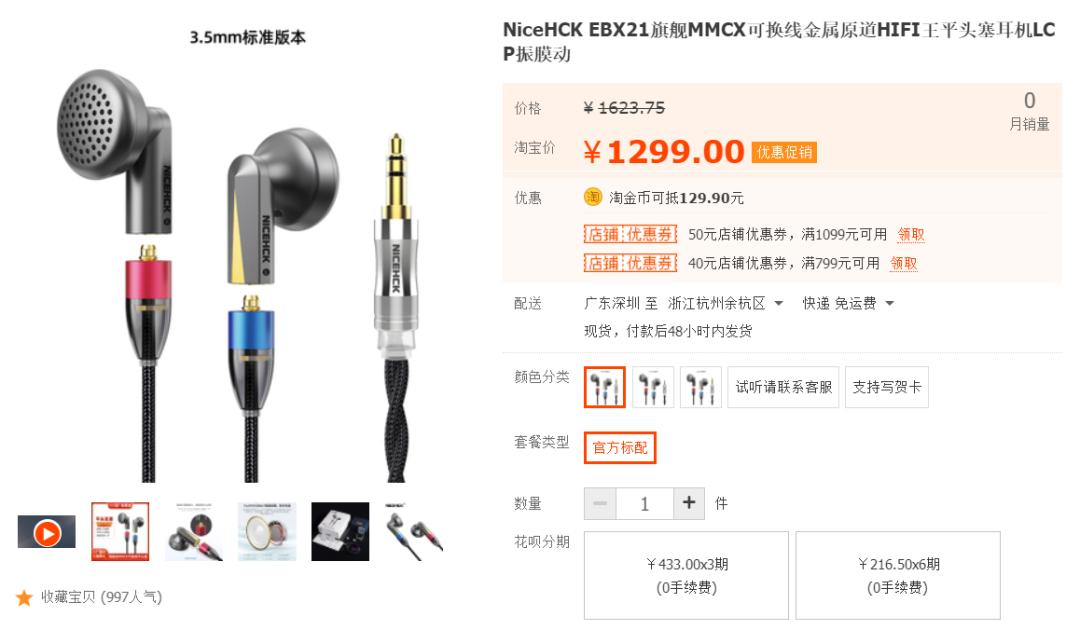然而我是万万没想到哇,这条 9.9 的原道耳机原来只能解一时之馋,至少对我来说是这样,因为在退坑一阵子之后,我那颗想 HiFi 的心又开始蠢蠢欲动了~正当我在某宝随便逛逛准备再次盲狙一款 HiFi 耳机时,一条售价 1299 的耳机无意间出现在了我的主页推荐流中: