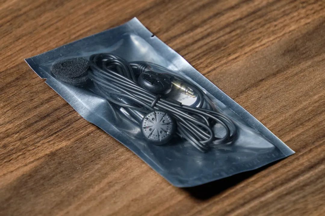 真的不得不说一分钱一分货,各位可以看到 9.9 的原道耳机( 目前已经降价 ),它只是用一个很简陋的塑料袋包着,里边附带两只海绵耳罩,别提有多寒碜: