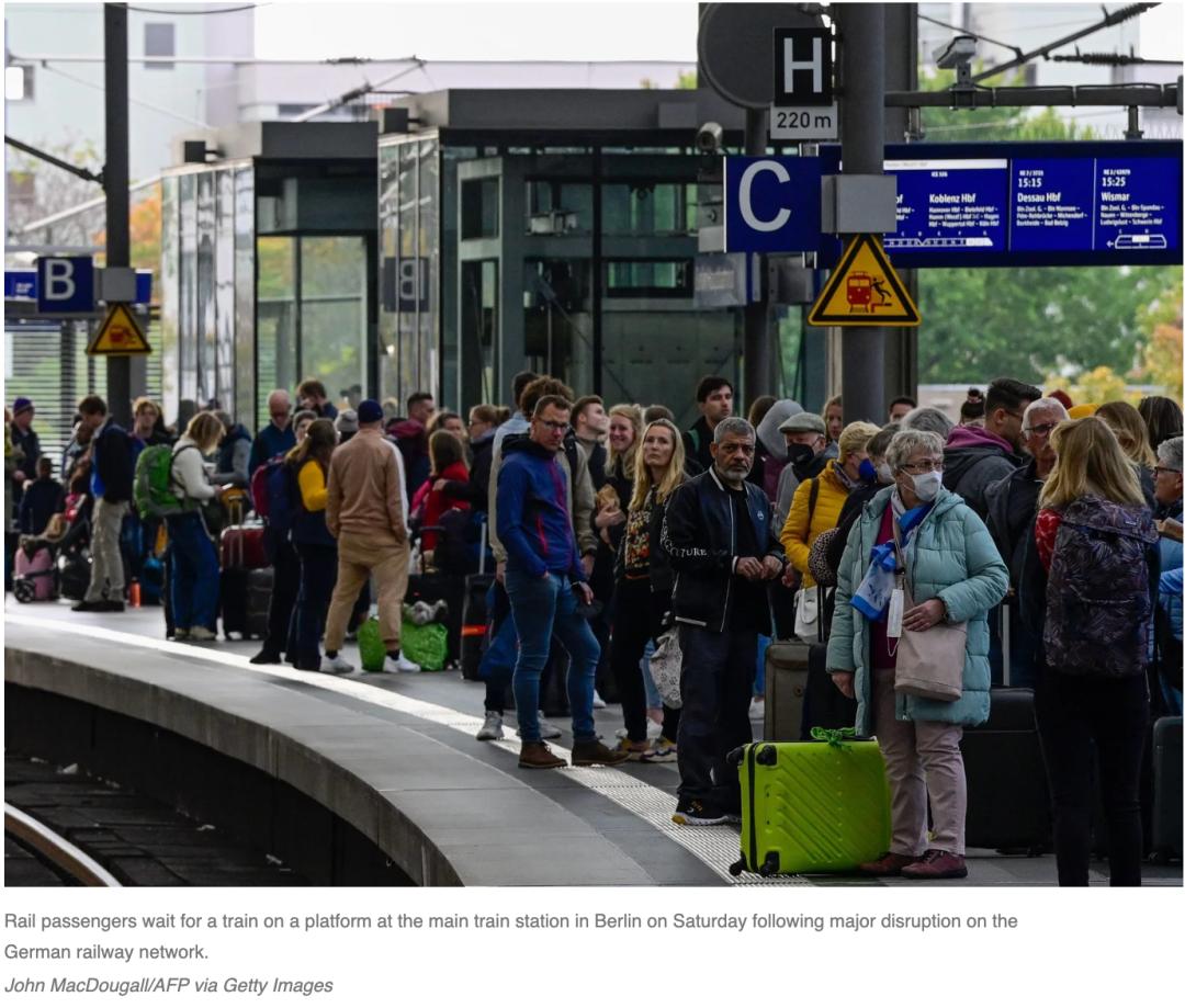 据德新社8日报道,德国北部地区的铁路交通当天一早便陷入瘫痪,大量旅客被困在火车站,在服务窗口附近排起长队,候车大厅的显示屏则全屏显示列车延误或取消。德国联邦铁路公司当天早些时候将网络中断归咎于无线电通信技术问题。德国《明镜》周刊称,通信系统于当地时间8日6时40分左右关闭。11时许,德铁公司在推特上发文称,铁路交通已经部分恢复,但警告仍将有列车取消或延误。列车中断影响了萨克森州、石勒苏益格-荷尔斯泰因州、不来梅市和汉堡市的铁路服务,并连带影响了德国前往丹麦和荷兰的国际铁路运输。