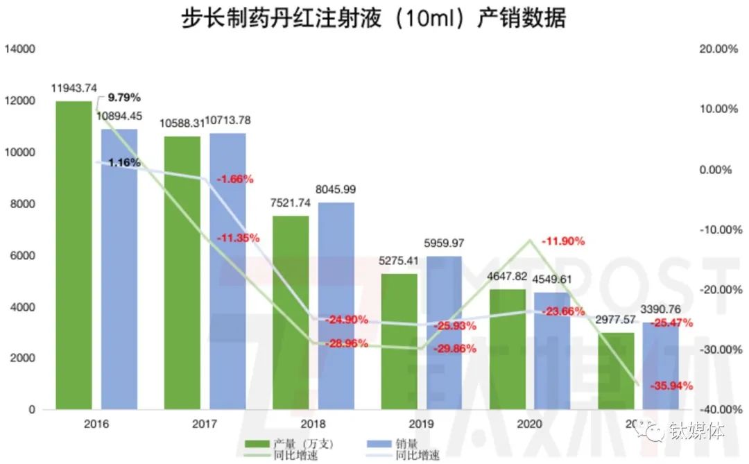 上市前的2015年,这两款药物合计收入占当年总营收的比重为60.25%,其中丹红注射液收入41.61亿元,占比35.70%,是“当家花旦”。虽然2016年至今,步长制药再未单独披露过此两款药品的收入情况,但从主要产品的产销数据来看,脑心通胶囊和丹红注射液的地位依然不可动摇,只是后者近年急速萎缩。一个重要的变化节点是鱼腥草注射液致死事件10年后。