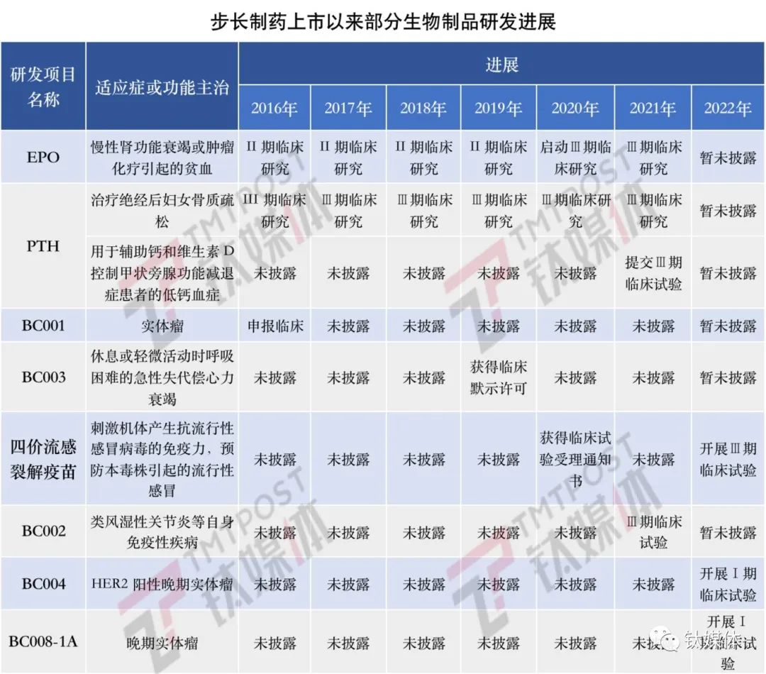 虽然看似研发管线遍地开花,进展却很缓慢。钛媒体App梳理步长制药上市以来的6份年报发现,公司只披露过5款生物药产品和1款疫苗的研发进展。2022年的公司公告新披露了两款实体瘤治疗用药(BC004、BC008-1A)的最新研发进展,均处于早期的Ⅰ期临床试验阶段。