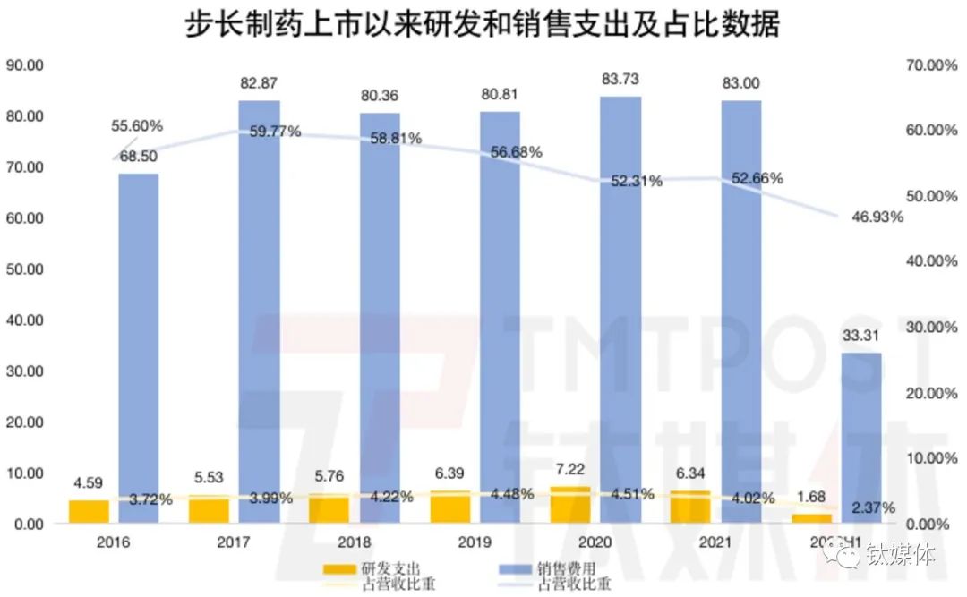 具体到步长制药,抠抠搜搜的研发投入背后是花钱如流水的销售费用,2017年2021年的年支出都在80亿元以上,“由销售型公司向科技型公司转换”,真的停留在了“口号”层面。钛媒体App就此询问步长制药内部对公司转型节奏的评估和把控,但也未获回复。