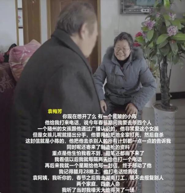 小陈说:“袁阿姨,春节过后,我想杀人。”他和随州的一个女孩谈恋爱,对方提出分手,他却深陷其中,再三央求复合,但都遭到了拒绝。心灰意冷的他想杀掉女孩一家后自杀。第二天,袁梅芳给小陈写了一封近5000字的长信。小陈回她:袁阿姨,你是对牛弹琴。他甚至把自制的枪支图案发给袁梅芳。