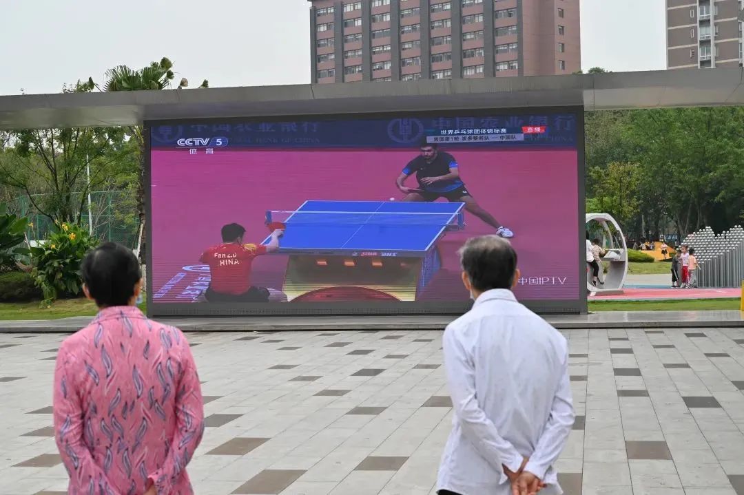 ▲成都市民街头观看比赛国乒双冠背后,更是高质量训练的成果体现。早在成都市世乒赛团体赛开赛前一个半月,国乒男女队就来到成都市乒校训练基地,进行了极具针对性的封闭训练。在女乒主教练李隼看来,国乒对成都有着深厚感情,每次来到成都就像回家一样,训练和生活都非常踏实。同样,男队主教练秦志戬也高度评价了成都对国家队封闭训练的周全保障。