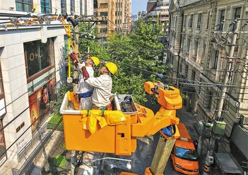 ▲国网上海市区供电公司员工在南京路开展带电作业