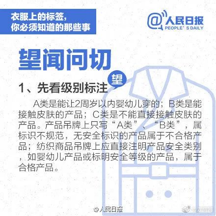 你会看衣服上的标签吗?查看衣服标签,要做到“望闻问切”:①“望”:查看产品安全类别、尺寸号型标和洗涤标志是否符合国家要求;②“闻”:合格的衣服不应该有异味;③“问”:询问销售人员衣服面料成分,做简单的测验;④“切”:通过手感来判断其面料成分,跟标注对比。下面通过一组图,小编教你如何正确地看标签买衣服!