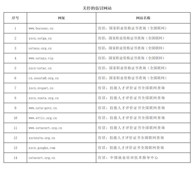 近日,根据网络巡查和群众举报情况,人力资源和社会保障部联合有关部门查实并关停了14个仿冒网站,其网站名称、网址及页面内容与人社部技能类“职业资格证书”“职业技能等级证书”查询官方网站高度相似,容易误导社会公众。目前,这14个网站均已被关停。