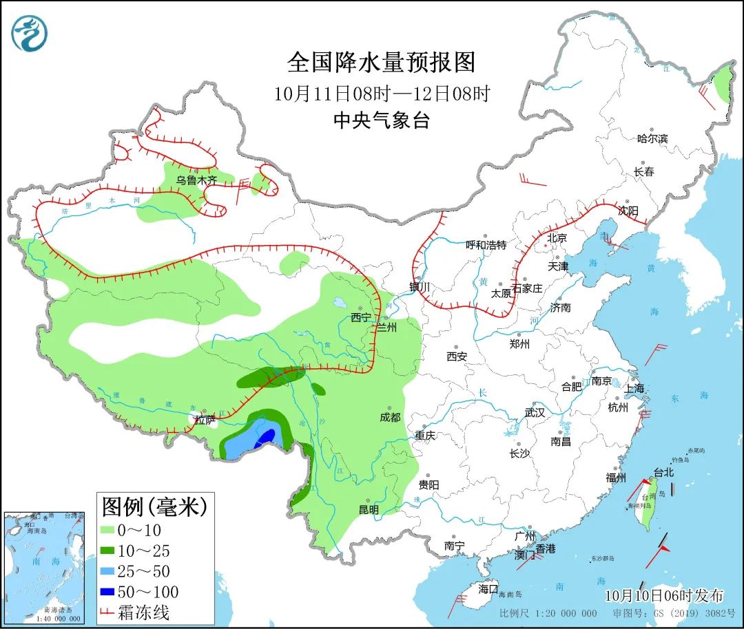 10月11日08时至12日08时,西藏大部、青海大部、甘肃东部、四川大部、云南大部、新疆南部山区和天山山麓等地部分地区有小到中雨,其中,西藏东南部局地有大到暴雨。内蒙古中部、黑龙江东部、辽东半岛、浙江东部等地部分地区有4~6级风。