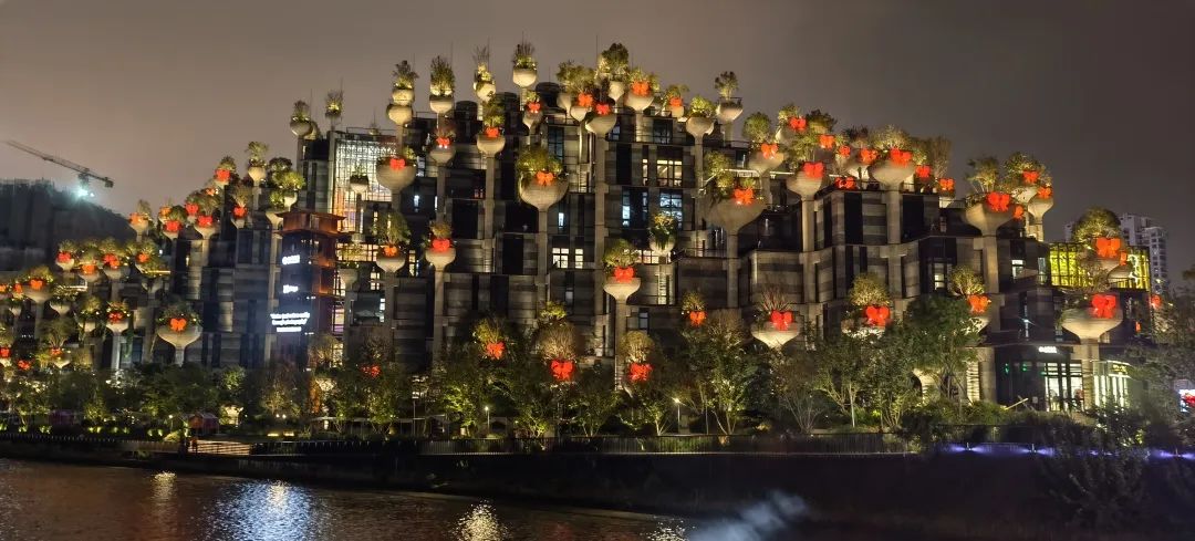 首先来到长寿湾,即见网红景点—天安千树,这座建筑的顶部由1000根错落有致的长方形柱体组成,承载着1000多棵生长于中国山岳之间树木的“悬浮森林”,让人眼前一亮、过目难忘。