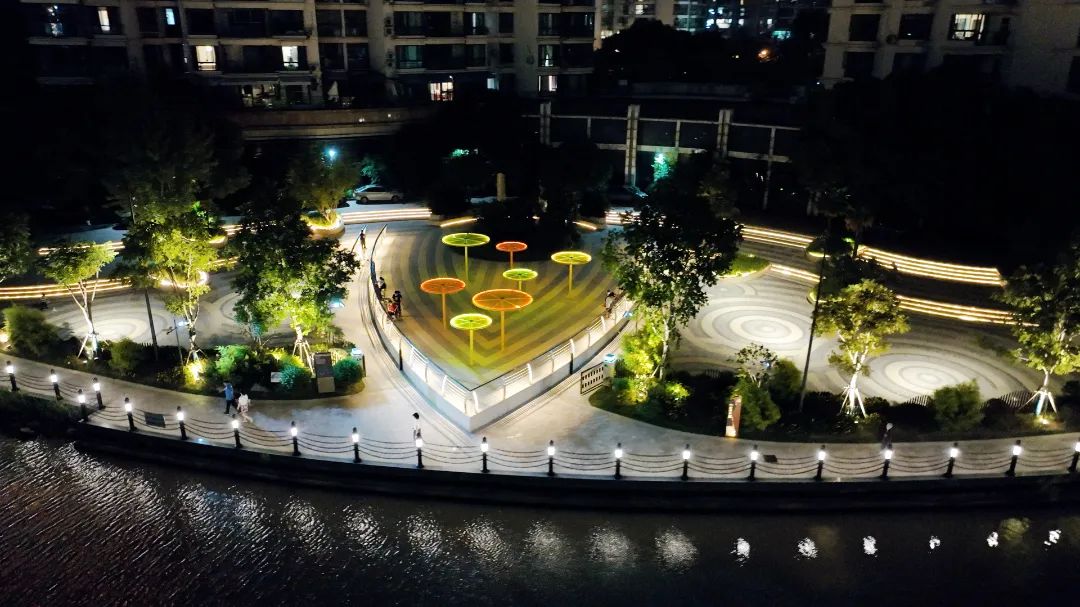 穿过西康路桥,随即绕过小花园湾,则进入到幸福生活岸线。夜晚的居民众多,有的夜跑,有的踱步,有的则在随身携带的音响伴奏下,幸福舞蹈。新增的投光灯则默默打亮树冠,为舞者照亮“舞台”。