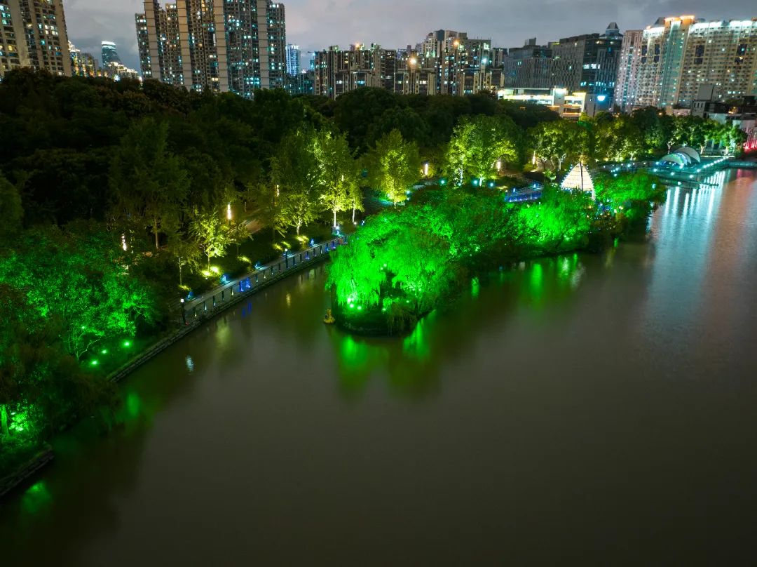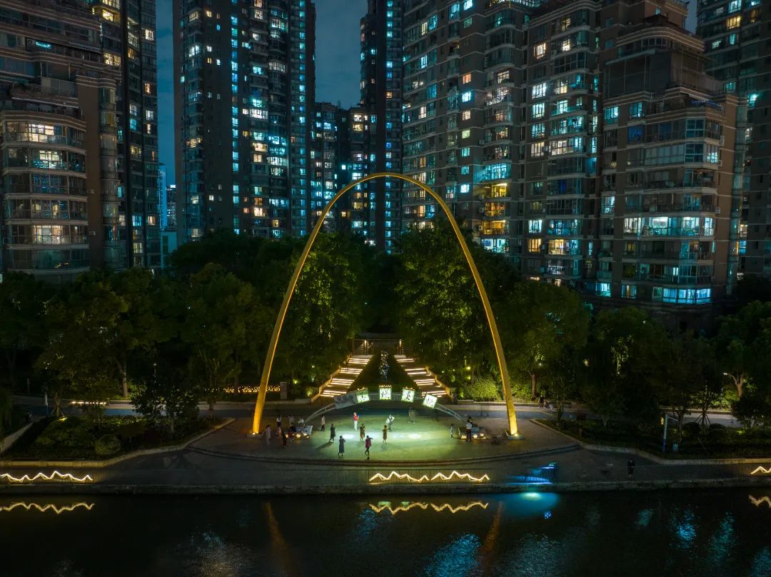 绿地里静谧萤光与长风跨采中心等商务楼宇的绚丽遥相呼应。同时,随着苏河夜游的启动,长风码头和远处的丹巴路码头也变的光彩夺目。