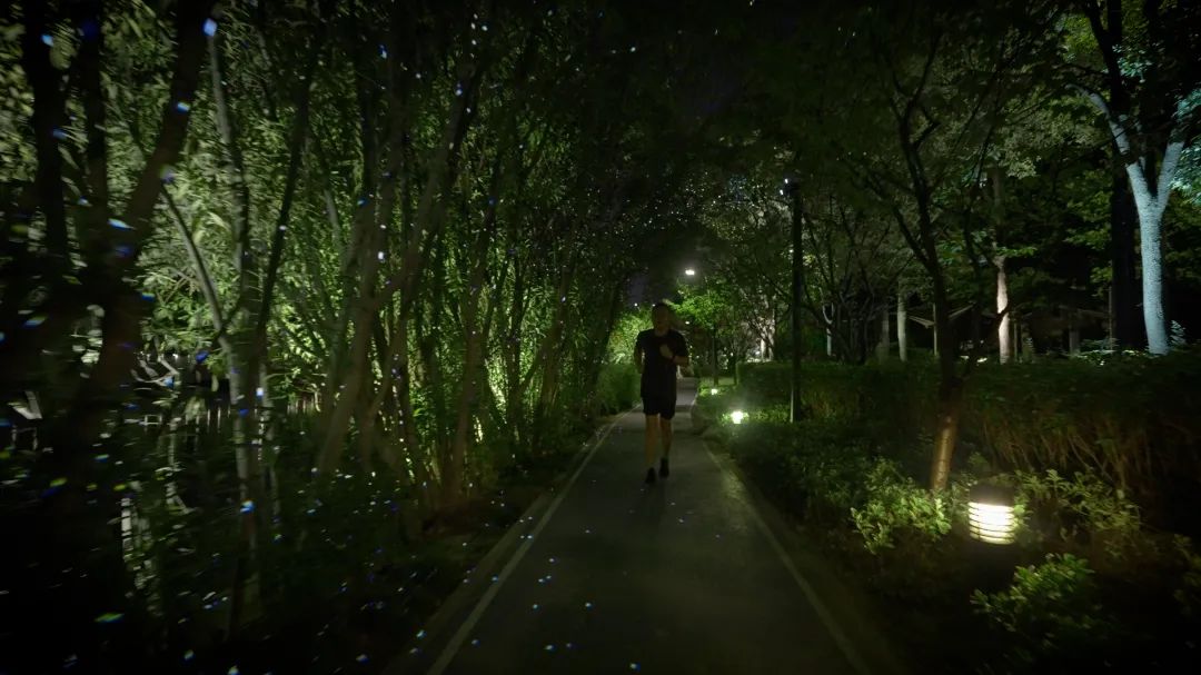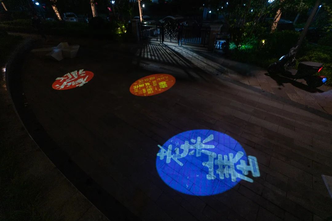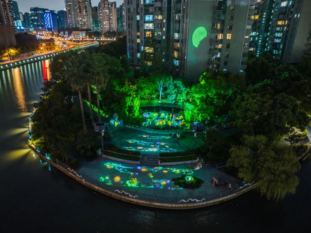 绕过朱家湾,沿南岸步行向着小花园湾,则是处处充满童趣的互动岸线。除了草丛里的投光灯将树冠打亮以外,每一处节点广场都设置了互动投影。