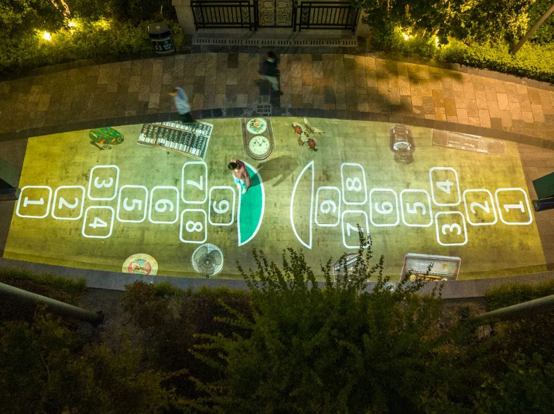 充满童年回忆的“跳房子”,吸引着大小朋友们在方格上欢快的跳跃,小朋友们的脚步发出清脆的铃声和多彩的光芒,“大孩子们”则重温着童年的回忆,真正的让光影与人产生共鸣。