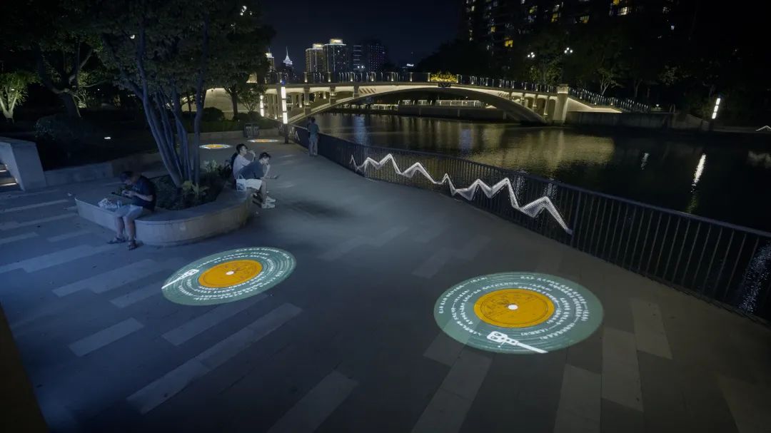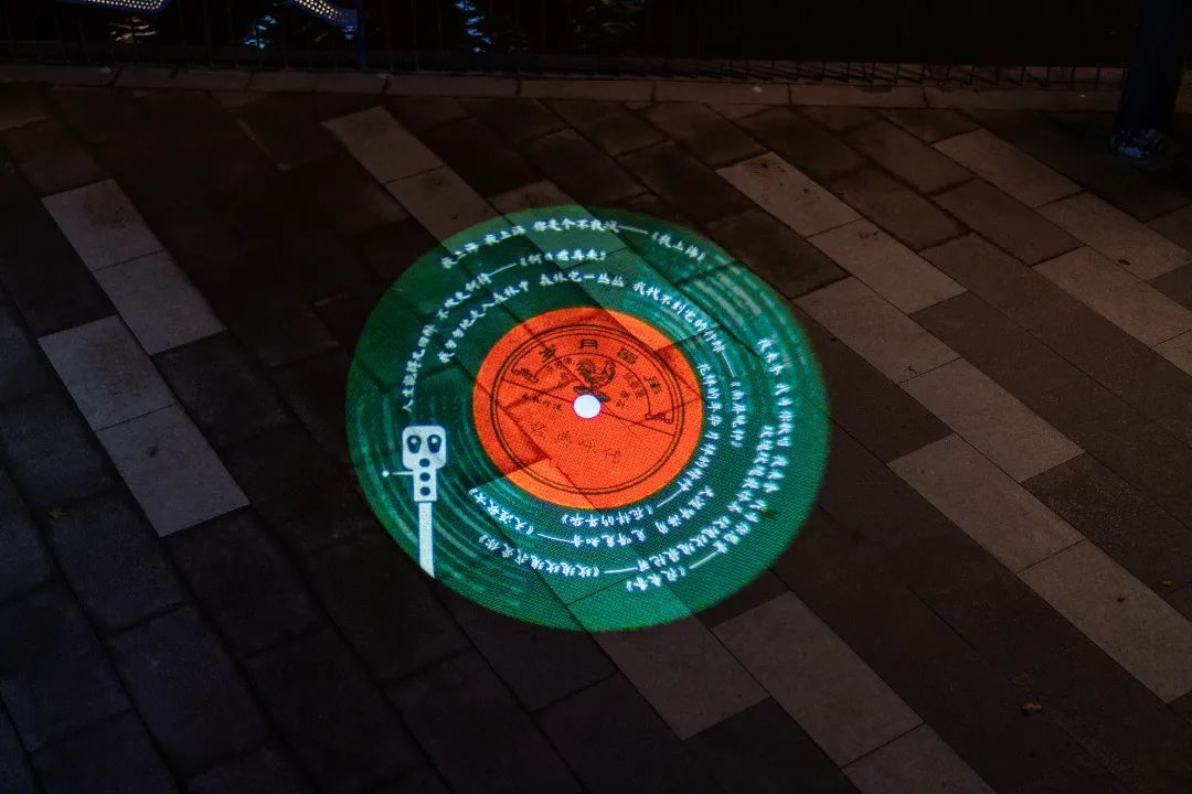 临着宝成桥下南岸,特地设置了“老唱片广场”,数个投影灯将上海的“老唱片”投射在地面,各色唱片在地面上缓缓旋转播放,对应的老上海唱腔缓缓响起,吸引着来往的居民驻足停留,随之起舞、歌唱。