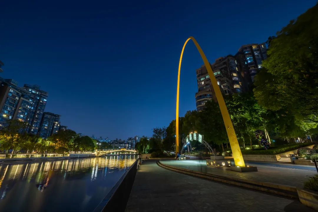 继续向西前行,穿过宝成桥,就来到了苏堤春晓,暖色投光灯精确地勾勒出拱形门充满张力的曲线,给人们带来向上的活力。