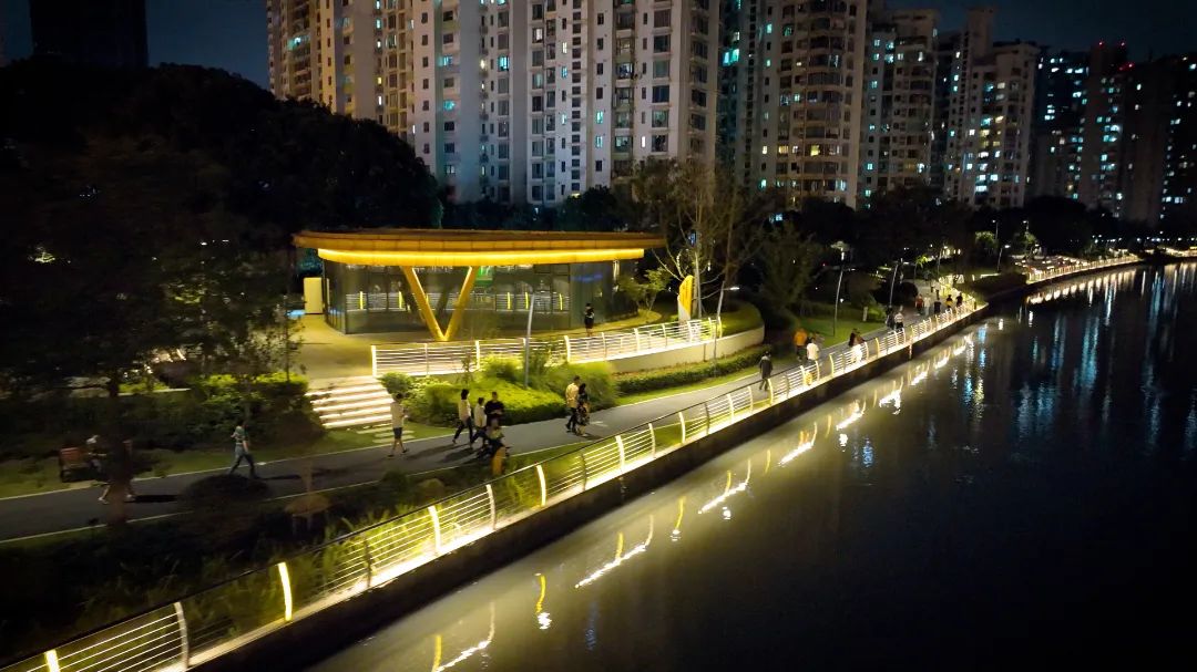 穿过昌化路桥向西,便是中远两湾城滨水步道。本次改造将原来彩色的岸线栏杆灯替换成了3000K的暖色光,改造后的岸线栏杆灯变得更加温暖与宁静,光影变得柔和内敛,将“璀璨”留给了来往的市民。
