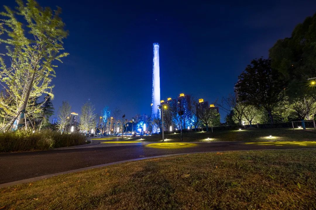 原上海试剂总厂62米烟囱如今“披上”了光影,继续述说着苏河沿岸历史记忆。