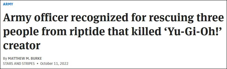 据美国军方《星条旗报》10月11日报道,一名驻日美军军官于7月在冲绳一处潜水点救出了三名被卷入激流的游客。这名军官在近日确认,日本知名漫画《游戏王》的作者高桥和希当时也在场并下水帮忙,但他在施救过程中被激流吞没,不幸溺亡。