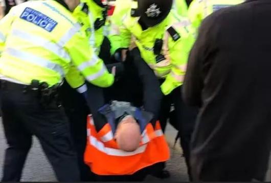 伦敦警方11日拖走一名示威者 社交媒体图抗议者们的行为,引起了路人和英国政界人士的不满。此前一天,他们在伦敦林荫路(The Mall)上抗议,同样阻碍了交通,这引起现场司机的不满。