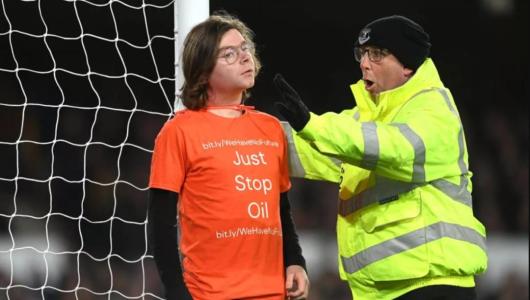 今年3月埃弗顿和纽卡斯尔的英超比赛上,古迪逊公园球场内冲入一名抗议者。他径直跑向球场一侧的大门,用一根束线带把自己绑在了门柱上。值得注意的是,他身上的标语很眼熟,就是“Just Stop Oil”。