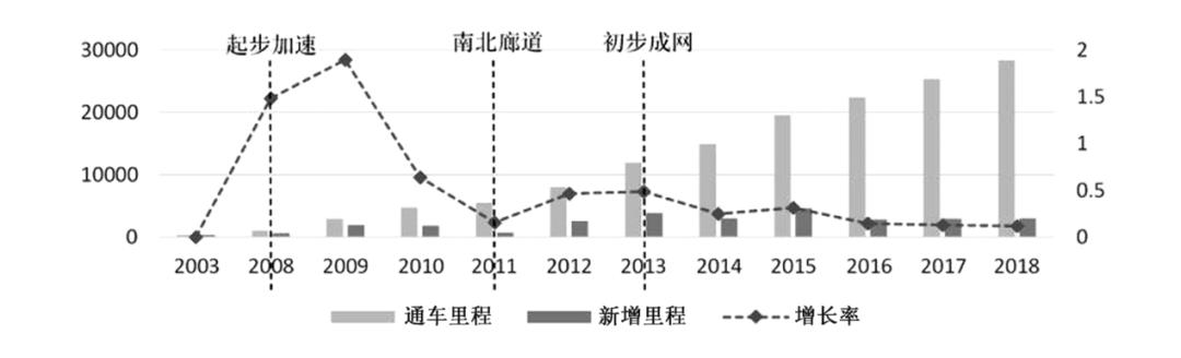 中国高铁建设阶段划分我国高铁网络建设分为四个阶段,2003~2008年为试营阶段,2008~2011年为起步发展阶段,2011~2013年为初步成网阶段,2013~2018年为加密强化阶段。以2013年为界限,可以清晰地看到,中国的财富与资本加速向高铁网络中的特大型枢纽城市流动。