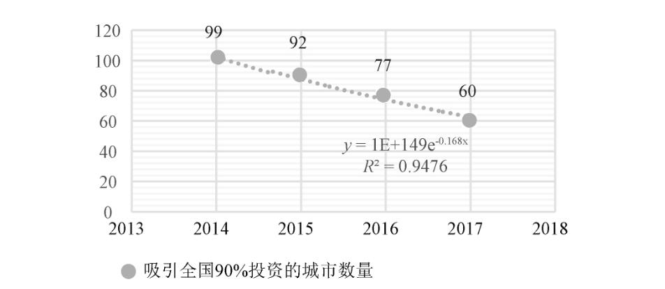 但另一方面,城际投资的集中度却在快速上升,按获得城际投资额排名累积,90%以上的投资在2014年流入99个城市,而2017年则集中在60个城市,四年间缩小了33.3%。如果只考察文化、科技、金融等高端行业的城际投资情况,则绝大部分的投资集中在27个城市之内,这些城市全部为高铁网络中的重要节点和超大城市。