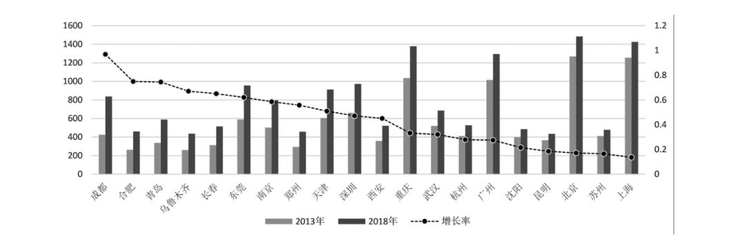 全国最大 20 座城市 2013 - 2018 年空间增长速度在第三轮增长中,省会以上城市获得了最大收益,2013~2018年,省会城市人口普遍增长了50%以上,相应地在城市空间扩张上的动力非常的充足。我国目前建成区最大的前20个城市中,90%为省会以上级别城市,并且铁路可达性变化量与这些城市空间增长率之间存在较高相关性,两个变量回归分析的拟合优度约为0.8,置信度为95%。