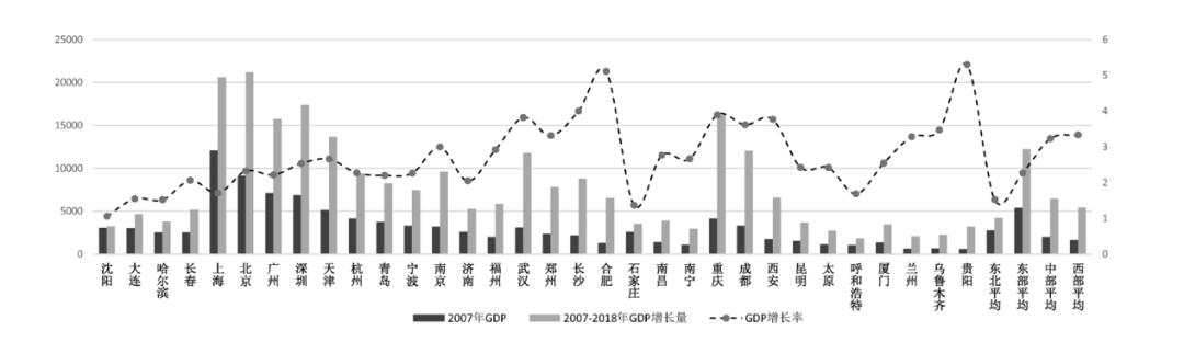 2007-2018年省会以上及全国前50位非省级地级城市排名位次变化相应的这些省的地级城市排名下降的幅度也是最大的,从2007~2018年经济总量排名上升比例来看,中西部省会全部上升,而中西部地级城市只有15%的城市排位上升,而其余90%的地级市排名下降。