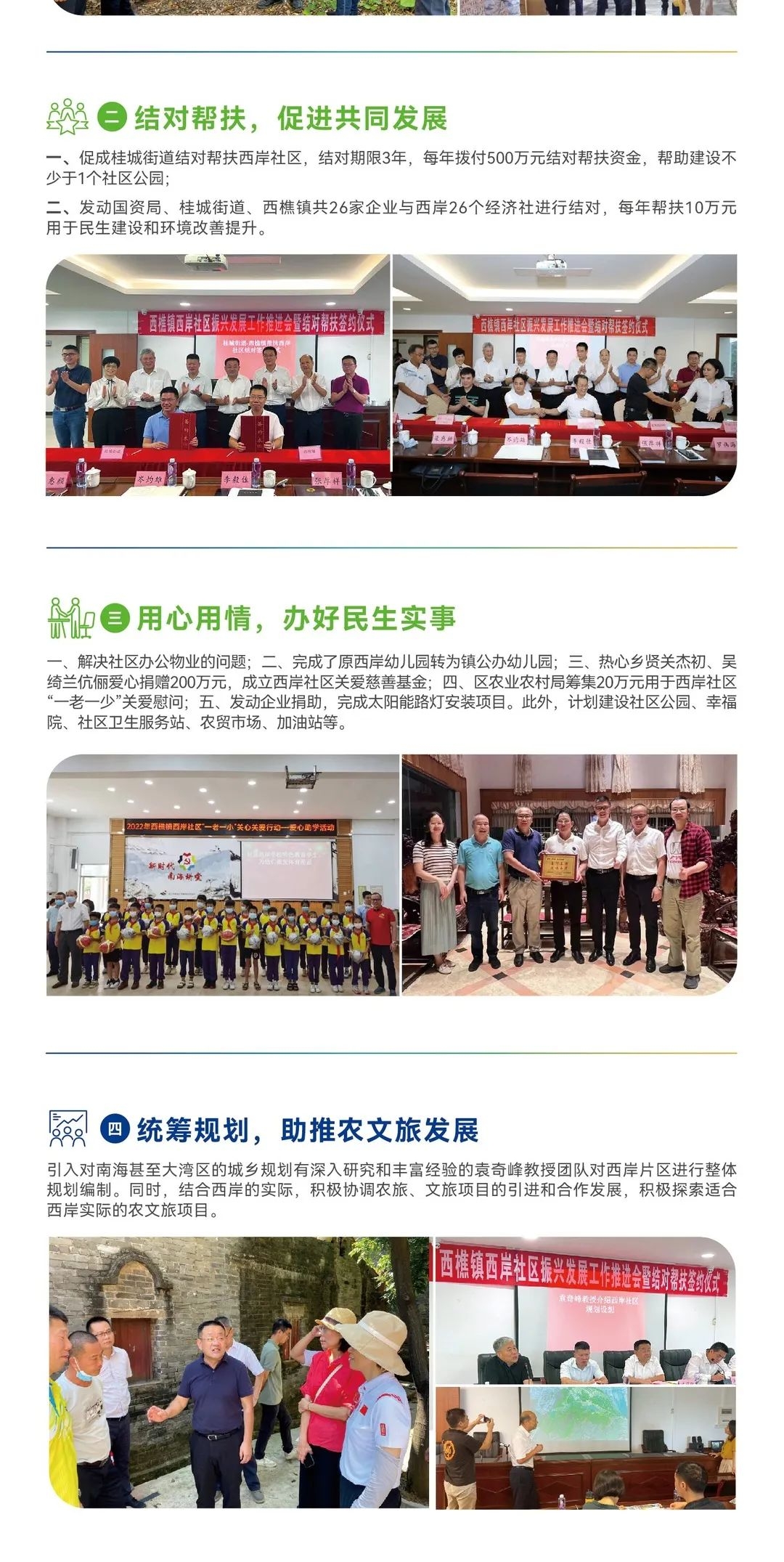 区、镇工作专班协调各方、精准施策,为西岸注入“共富”活水;桂城街道和西岸社区结对“认亲”,聚焦基层党建、集体经济、公共设施等方面,开展全方位帮扶,促进西岸社区内生造血功能;热心乡贤各展所长,助力西岸发展。26家企业结对西岸26个经济社,通过“一社一企业”,推动西岸民生福祉改善提升。一个个民生项目的落地,一件件民生实事的落实,在西岸群众中引起强烈的正面反响,得到群众的纷纷点赞。