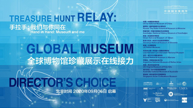 “馆长天团”齐聚云端,凝聚博物馆力量。2020年9月6日至9月14日,中国国家博物馆发起主题为“手拉手:我们与你同在——全球博物馆珍藏展示在线接力”活动,以接力直播、在线联展的方式,将各馆珍藏文物集中呈现在全球观众面前。9月6日,中国国家博物馆在中央广播电视总台的大力支持下,率先启动接力活动“第一棒”。在直播活动中,王春法馆长为全球观众介绍了馆藏陶鹰鼎、错金银云纹铜犀尊、伏羲女娲像立幅、针灸铜人、霁蓝釉粉彩描金莲花纹双燕耳尊五件精选文物的历史价值、审美价值、科学价值、文化价值和时代价值。9月7日起以“直播态”接力路线,每天平均推出两家博物馆专场,每场约为60分钟,内容包括中国国家博物馆馆长与外方馆长的跨国视频连线互动和外方馆长讲解“馆长之选”等。9月7日至14日,俄罗斯国家历史博物馆、波兰华沙国家博物馆、斯洛文尼亚国家博物馆、列支敦士登国家博物馆、南非迪宗博物馆联盟:国家文化历史博物馆、澳大利亚国家博物馆、阿根廷国家美术馆、美国弗吉尼亚美术馆、美国佛利尔美术馆和赛克勒美术馆(史密森国家亚洲艺术博物馆)、韩国国立中央博物馆、新加坡亚洲文明博物馆、泰国曼谷国家博物馆、哈达克斯坦国家博物馆、阿曼国家博物馆、大英博物馆等15家博物馆馆长相继接力亮相。本次活动展示的文物藏品均为“馆长之选”,具有独一无二的珍品价值,每一件都意义非凡。14日闭幕当天俄罗斯国家历史博物馆、澳大利亚国家博物馆、阿根廷国家美术馆等8位参与国馆长出席远程多边连线会议,分享活动感受,进一步表达团结合作、凝聚人心,为人类的文明进步提供强大动力的共同愿望。