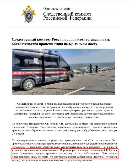 然而,在Семён Пегов引用的这份10月8日的调查报告中,俄罗斯联邦调查委员会仅声明“确定了卡车及其所有者的数据,是克拉斯诺达尔地区的一名居民”,对司机身份没有更多披露。