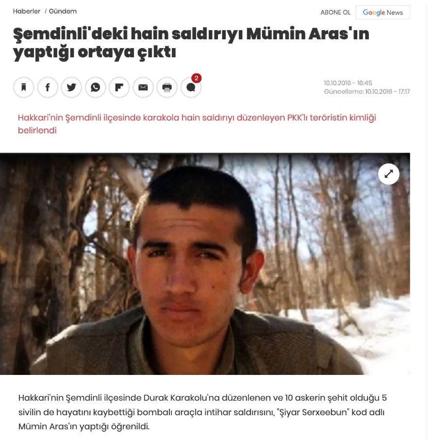 不过,Gerila TV网站并不支持图片反搜,因此,“澎湃明查”利用人脸识别工具Pimeyes对网传图片进行检索,得到该人物在其他场景下的照片。在谷歌和Yandax反搜这些照片,能够追溯到土耳其官方媒体Habertürk在2016年10月10日的报道,称“代号为‘Şiyar Serxeebun’的PKK成员Mümin Aras在土耳其哈卡里省谢姆丁利区的宪兵检查站发动自杀式汽车炸弹袭击”。