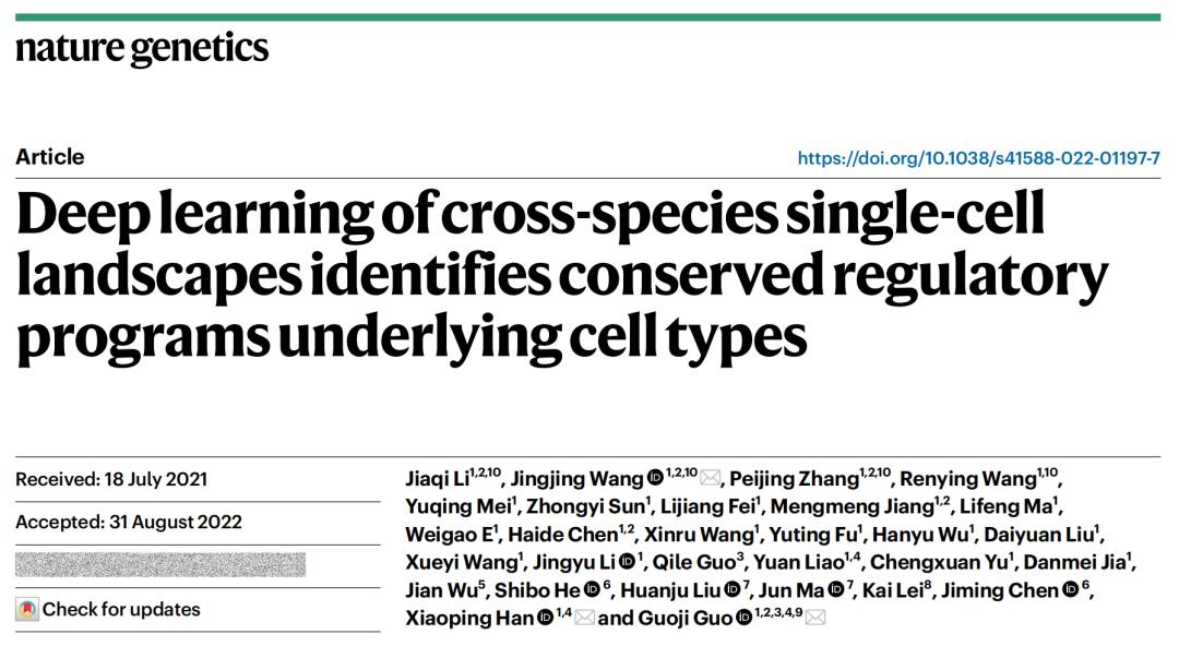 2022年10月13日,浙江大学基础医学院/浙江省良渚实验室郭国骥/韩晓平团队在Nature Genetics上发表了文章 Deep learning of cross-species single cell landscapes identifies conserved regulatory programs underlying cell types 。该研究利用自主构建的高通量单细胞测序平台Microwell-seq绘制了斑马鱼、果蝇和蚯蚓的全身单细胞转录组图谱,并探究了八种代表性后生动物细胞类型的跨物种可比性,揭示了脊椎动物细胞类型保守的调控程序。此外,该研究提出了深度学习模型Nvwa(女娲),首次实现了完全基于基因组序列预测单细胞分辨率下的基因表达。该研究基于Nvwa模型学习衍生的谱系特异性基序,表征了跨物种细胞类型特异性的调节程序。