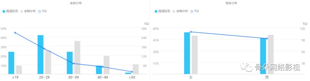 《摇滚狂花》上线之后,得到了不少年轻受众的喜爱。从用户画像中可以看出,30岁以下年龄层人群占比超过六成,且男女受众基本平分,这些特点在当下的现实主义剧集中都存在着一定的特殊性。