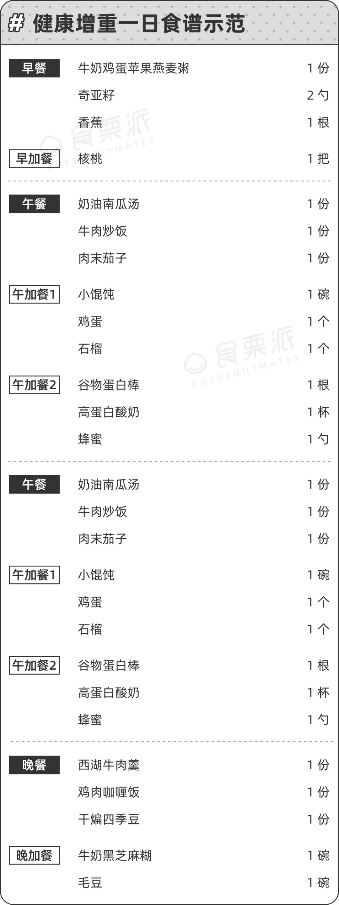 不知道什么叫做食物多样化?这份@注册营养师咖啡 制作的<健康增重一日食谱>示范,快收藏照做!