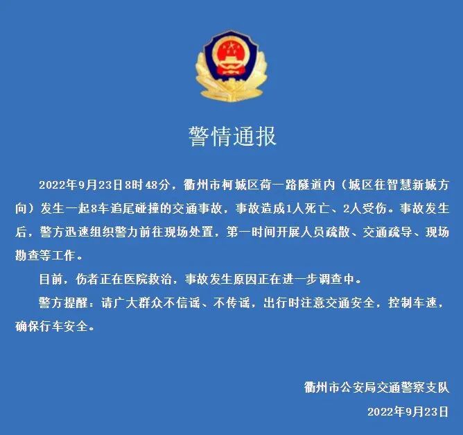 9月23日8时48分,浙江省衢州市柯城区荷一路隧道内(城区往智慧新城方向)发生一起8车追尾碰撞的交通事故,事故造成1人死亡、2人受伤。