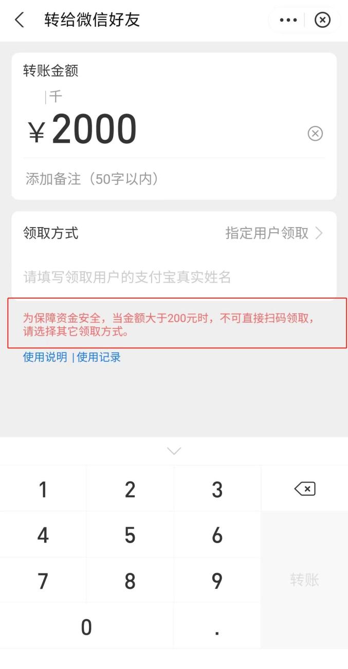 在转账页面,明确显示了单笔最多可转出人民币2000元,但允许添加50字以内的转账备注。转账人可以设置三种不同的领取方式:包括扫码即可领取、领取时对方需验证我的姓名首字、指定用户领取等。但需要值得注意的是,扫码领取仅限于金额在200元及以下的转账,当转账金额大于200元时,支付宝会提示为保障资金安全,不可直接扫码领取,请选择其他领取方式。