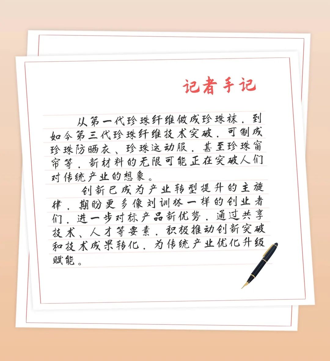 刘训林创办的公司曾经也是传统袜业生产企业。2015年,在转型升级大潮中,刘训林敏锐地将目光放到了新材料研发这片蓝海,致力于实现“将珍珠穿在身上”的梦想。2017年,他从最熟悉的袜子着手,率先发布珍珠纤维袜,在短时间内风靡全国,后又推出了珍珠羊绒衫、珍珠内衣裤、珍珠家纺产品等。