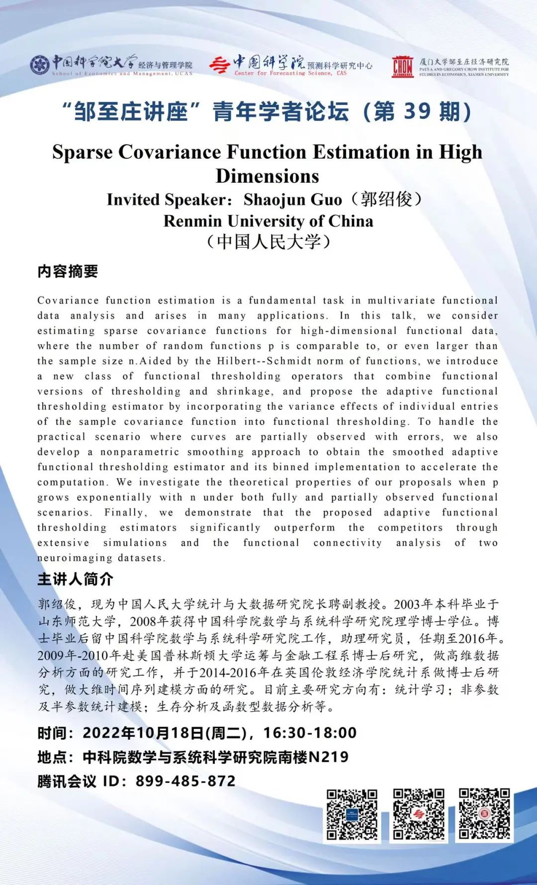 讲座主题:Sparse Covariance Function Estimation in High Dimensions