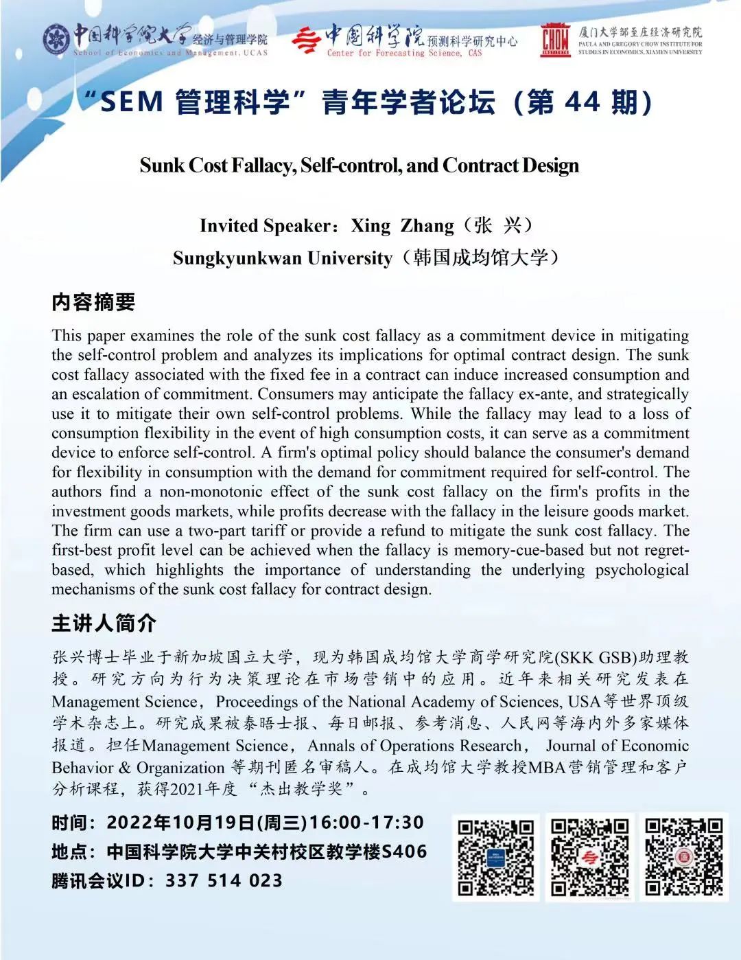 讲座主题:Sunk Cost Fallacy, Self-control, and Contract Design