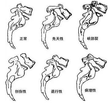 峡部裂型:骶骨上部或L5椎弓发育异常、椎体的椎弓峡部有裂隙不连续、等都可以导致椎体滑脱。
