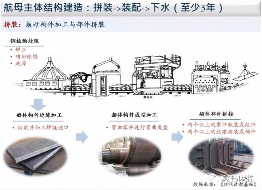 钢材备料是一个造船业的专有名词,指的是将造船所用的钢材送入预处理线(矫平、喷砂除锈、底漆)。钢材预处理流水线详解:钢板到厂后,先要进行校平,成为平整的钢板才能使用,接着去除锈。再经过预处理的航母钢板才能送入加工车间进行切割。航母用的钢板经过预处理和号料之后,就可以开始用来制造航母构件了。航母船体构件的加工可分为船体构件的边缘加工和成型加工两个部分。