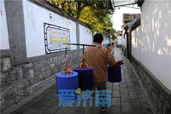 芙蓉街上的一处老宅门(张刚摄影)单应桂告诉记者,诗里提到的“门前古老石板路,水车轧过漉漉湿”,是济南当年真实的生活情景。“我印象最深的是剪子巷,巷子里有卖剪子的、卖刀的和卖炊具的。巷子里有个大泉池,很多人去挑水喝或者去卖。这条巷子也是石板路,石板已经磨得很光滑了。每次路过那里,一踩到石板上,泉水就从石板缝儿里冒出来,把鞋子浸湿。所以一到夏天,我干脆把鞋袜脱下来,光着脚踩在石板上浸着泉水走过。”